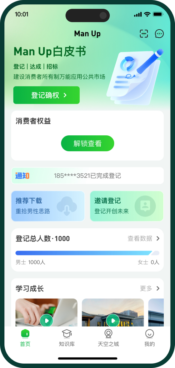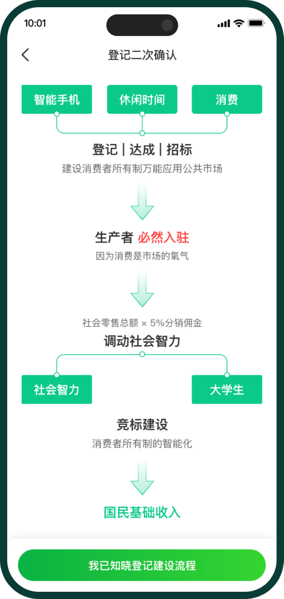 1、登记确权:用户通过阅读Man Up白皮书,了解中国发展面临的社会和环境问题,熟知Man Up解决问题的方案,完成无风险的登记确权,形成共建消费者所有制万能应用公共市场的共识。